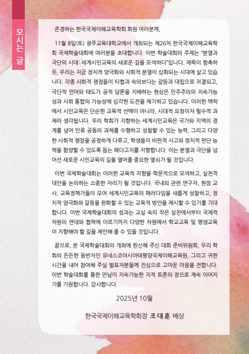 | ㆍ 제목 | [KOSEIU] 2025년 한국국제이해교육학회 제26회 국제학술대회 행사 안내 | |||